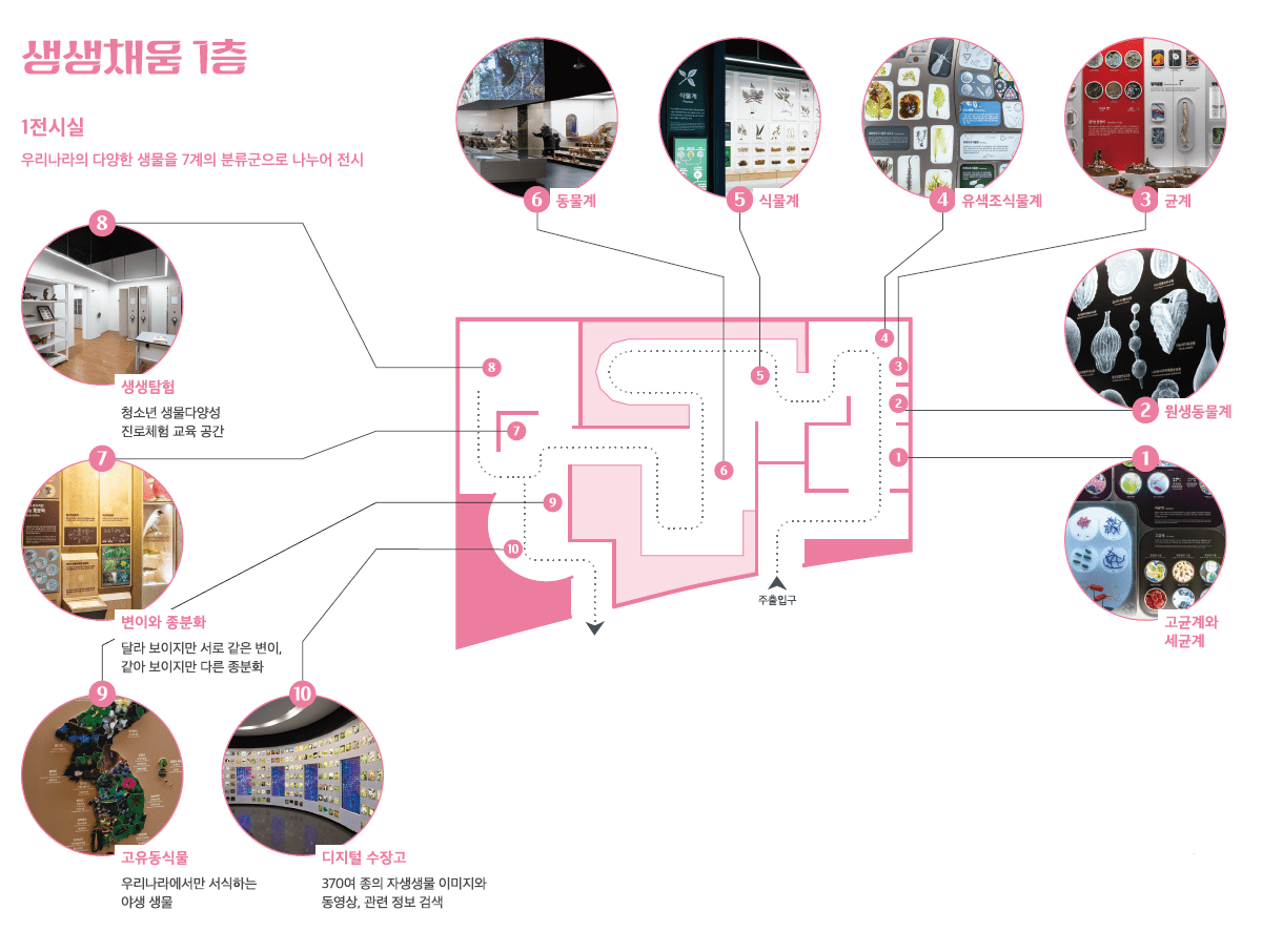 고균계, 세균계, 원생동물계, 균계, 유색조식물계, 식물계, 동물계 총 7계의 분류군으로 생물을 나누어 전시